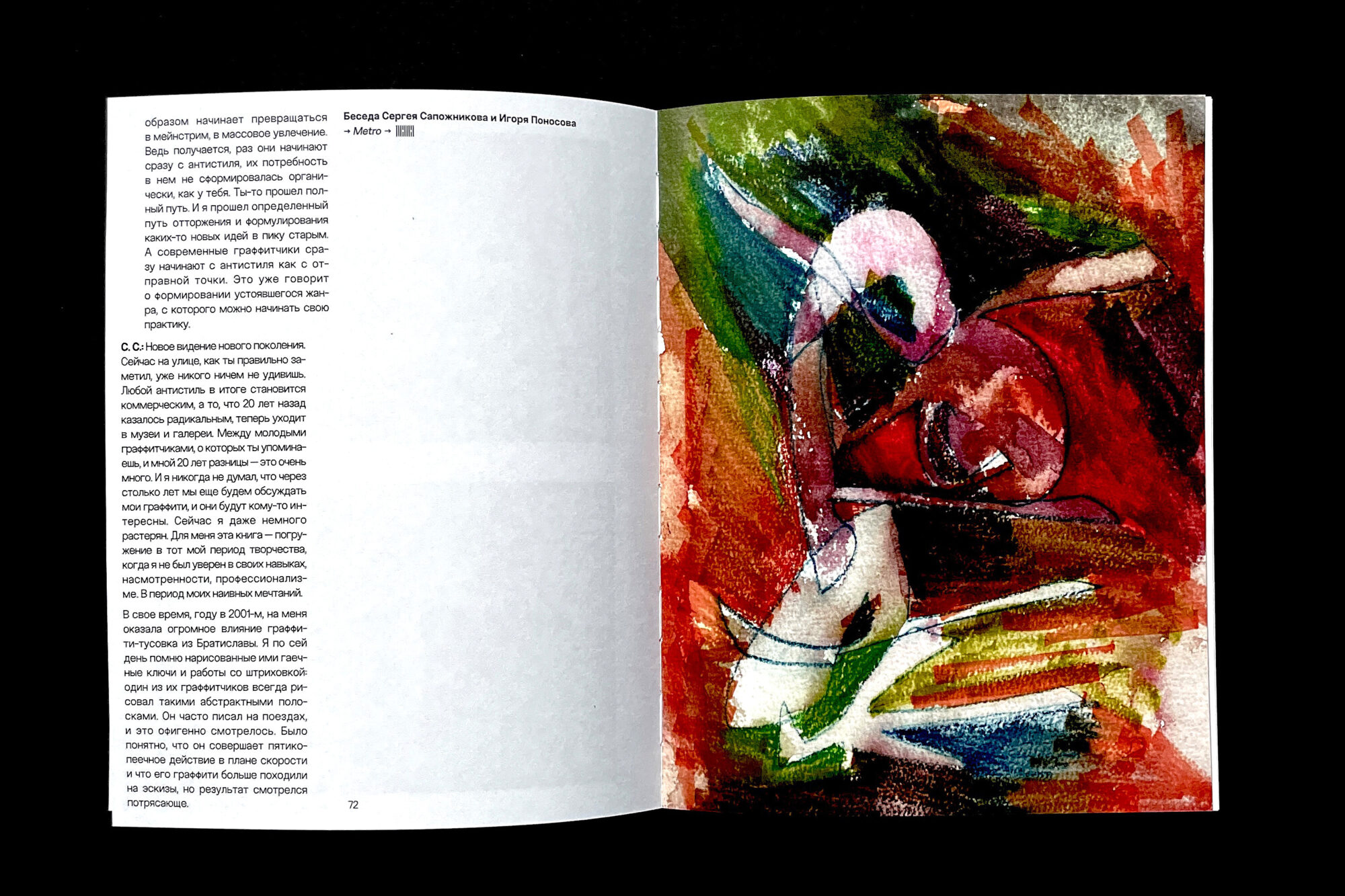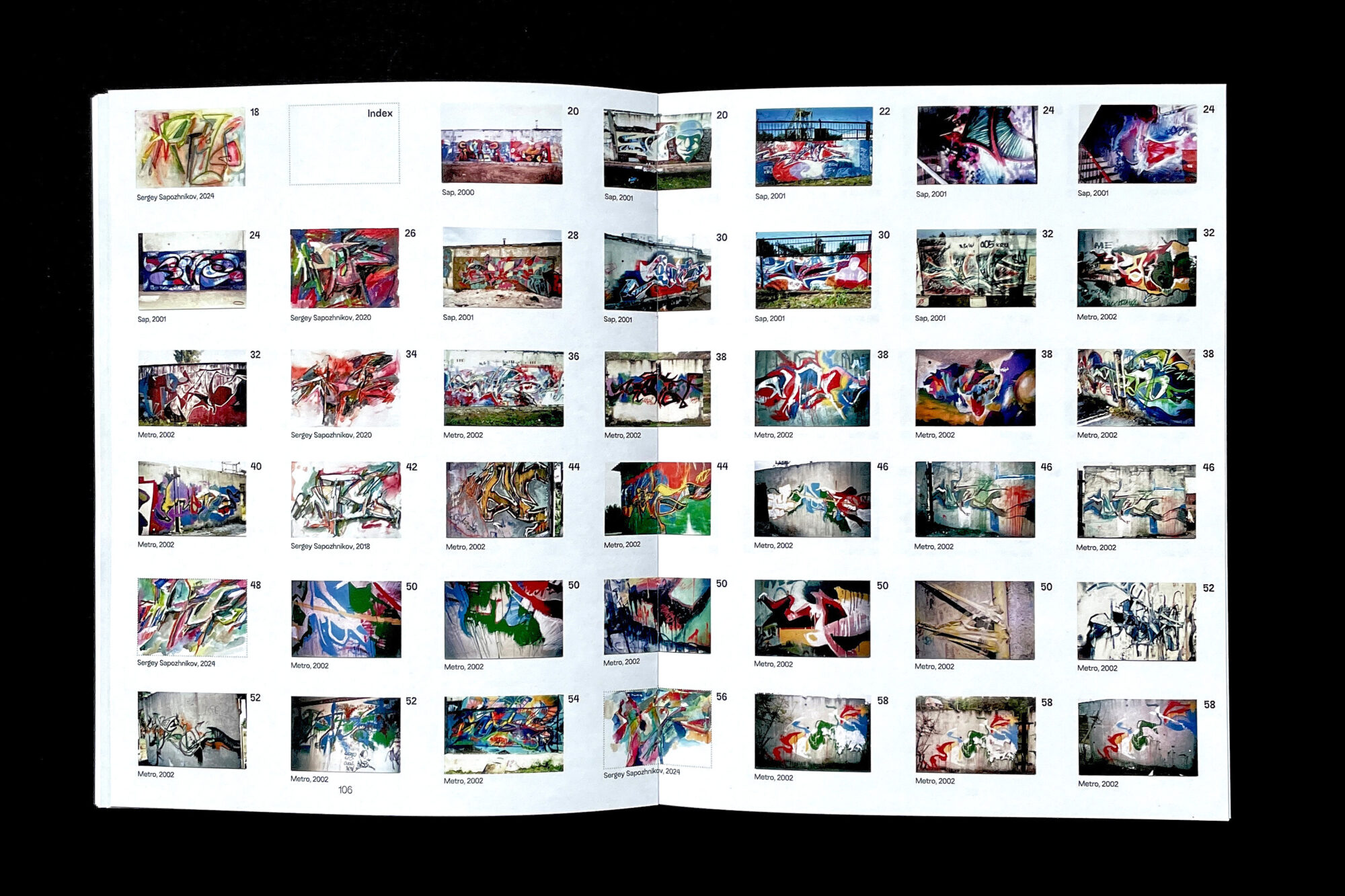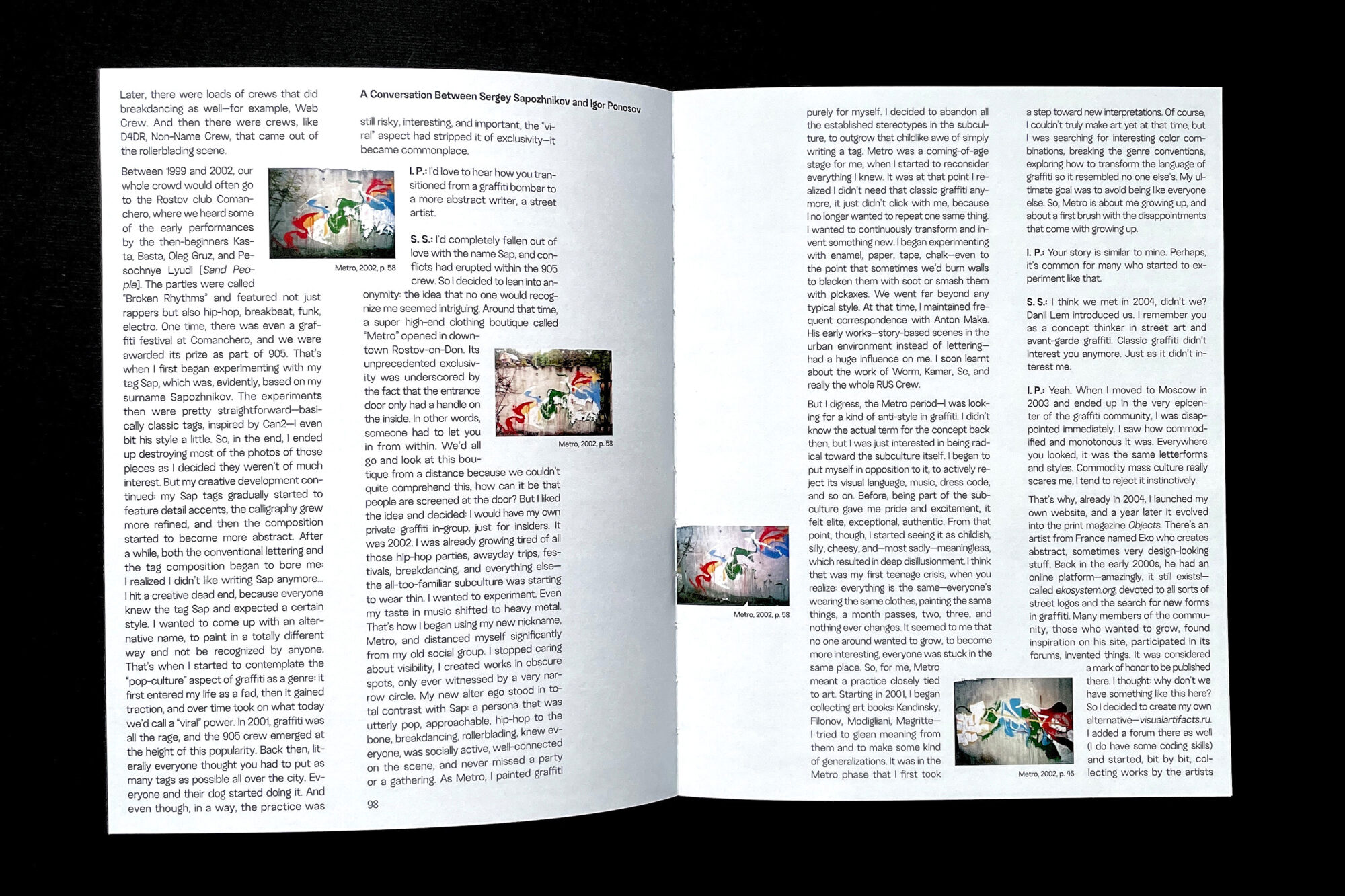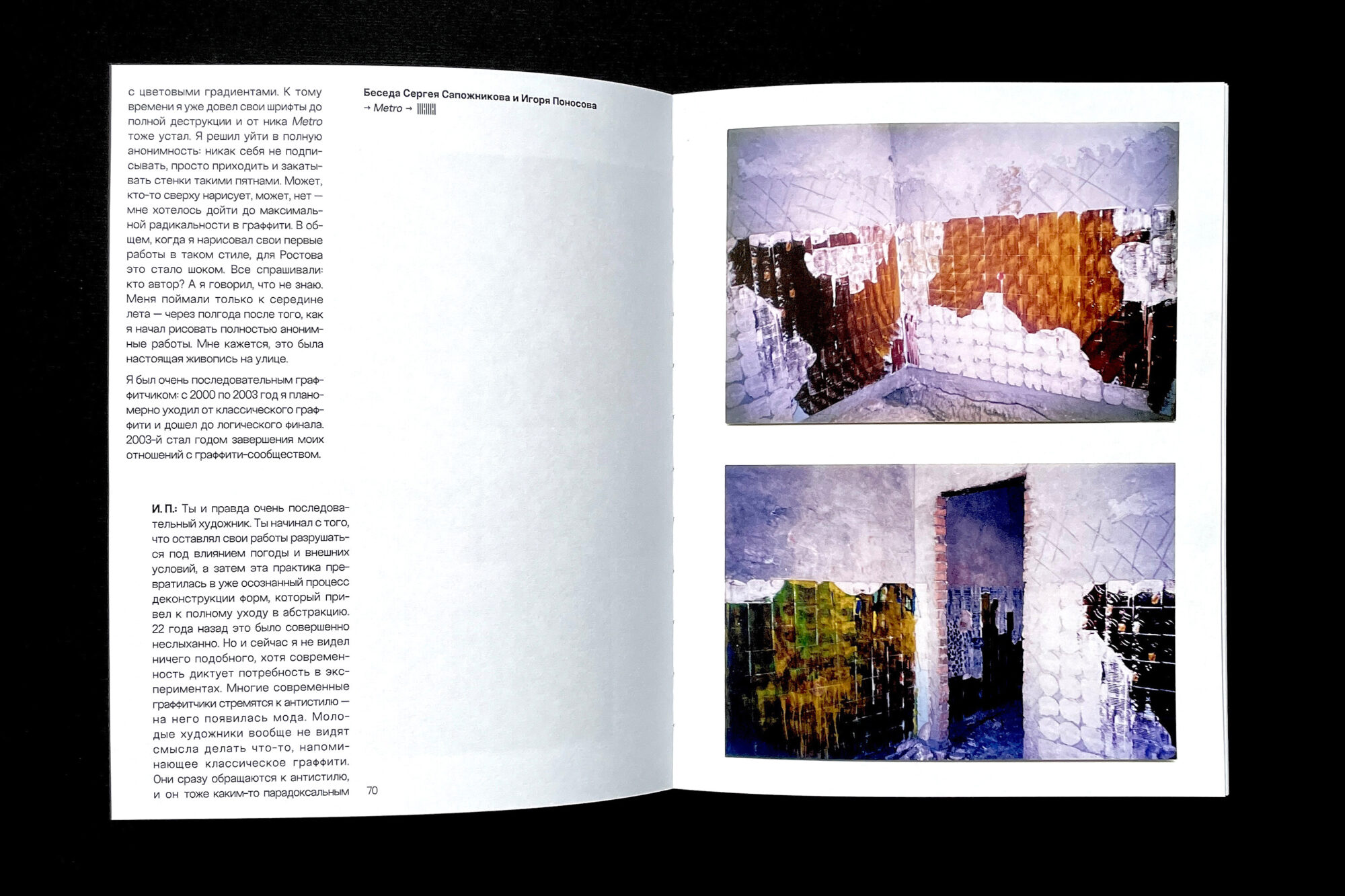 The book presents the early graffiti works of Sergey Sapozhnikov and his experiments from the early 2000s, which the artist created under the pseudonyms Sap and Metro, and later without any signature at all (|||¦||||). The core of the book is a conversation between Sergey and Igor Ponosov, who met through their shared interest in experimental street art.