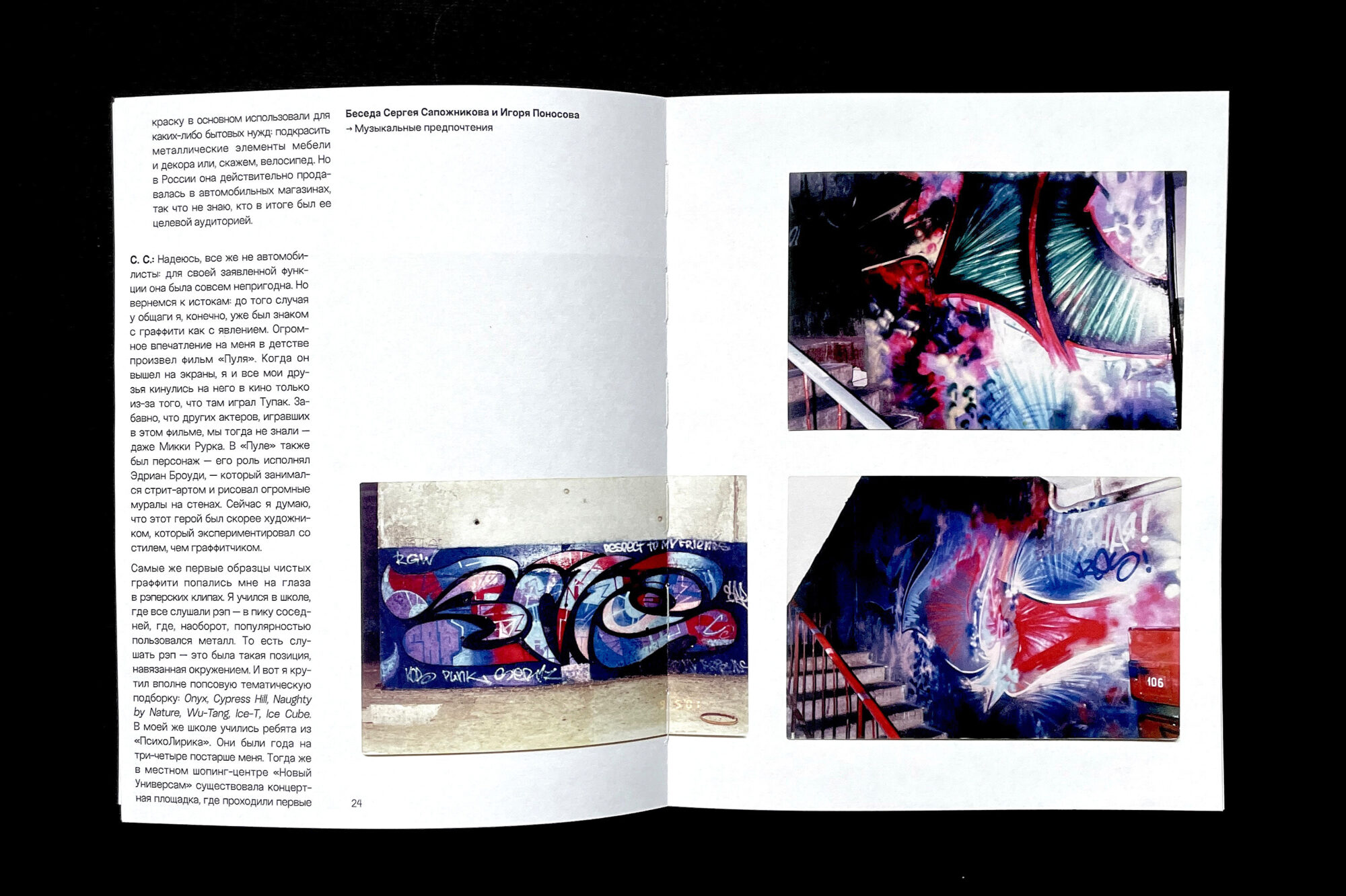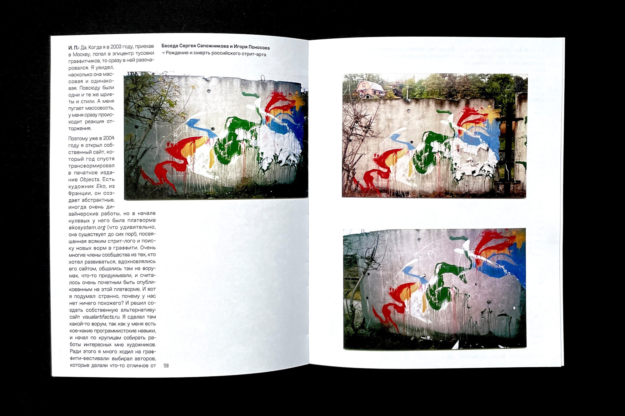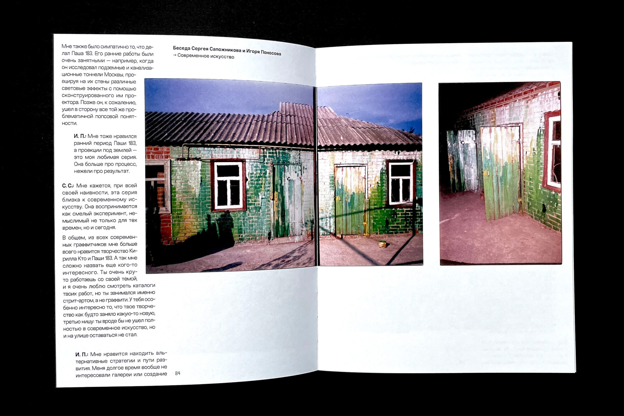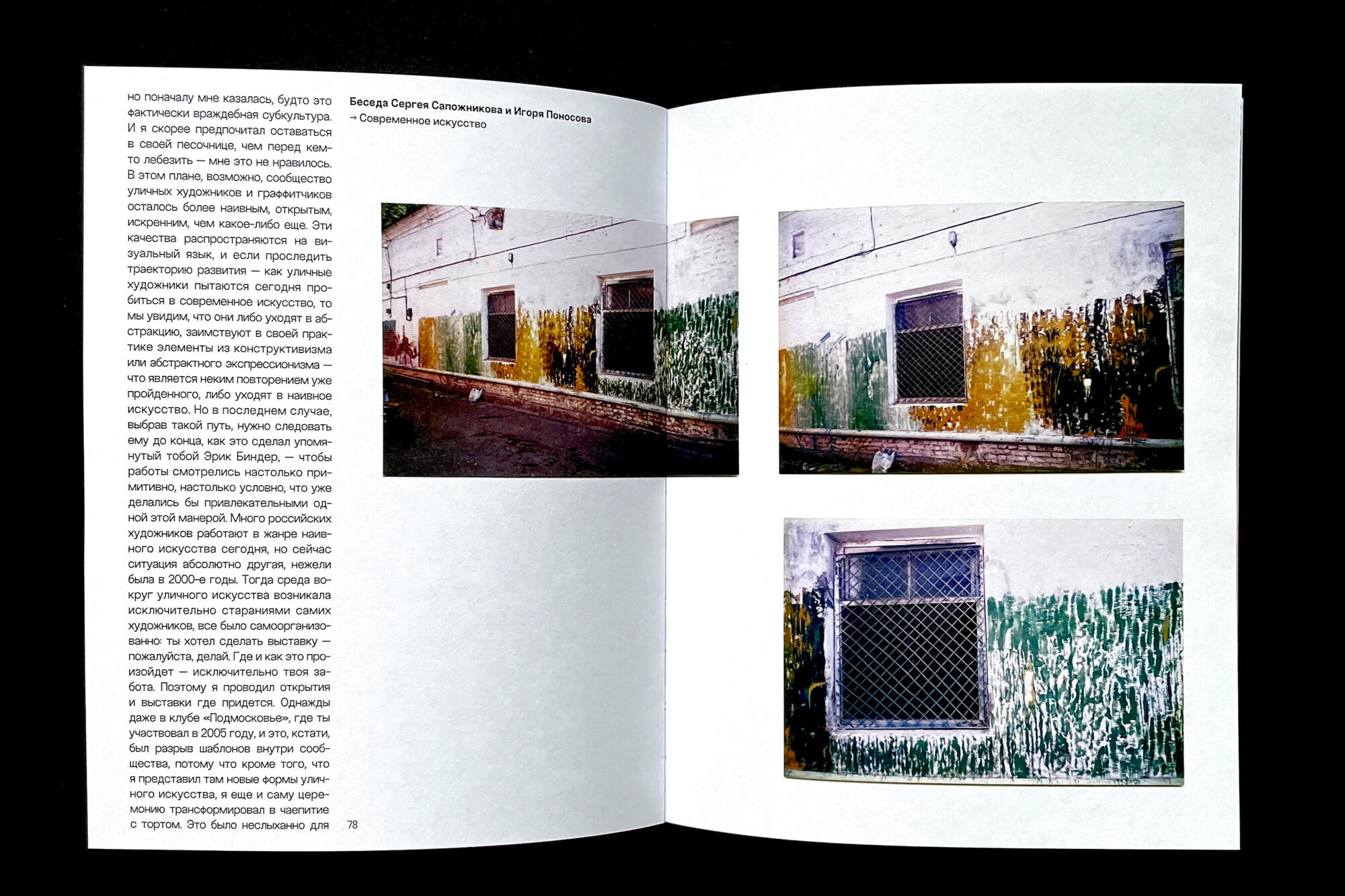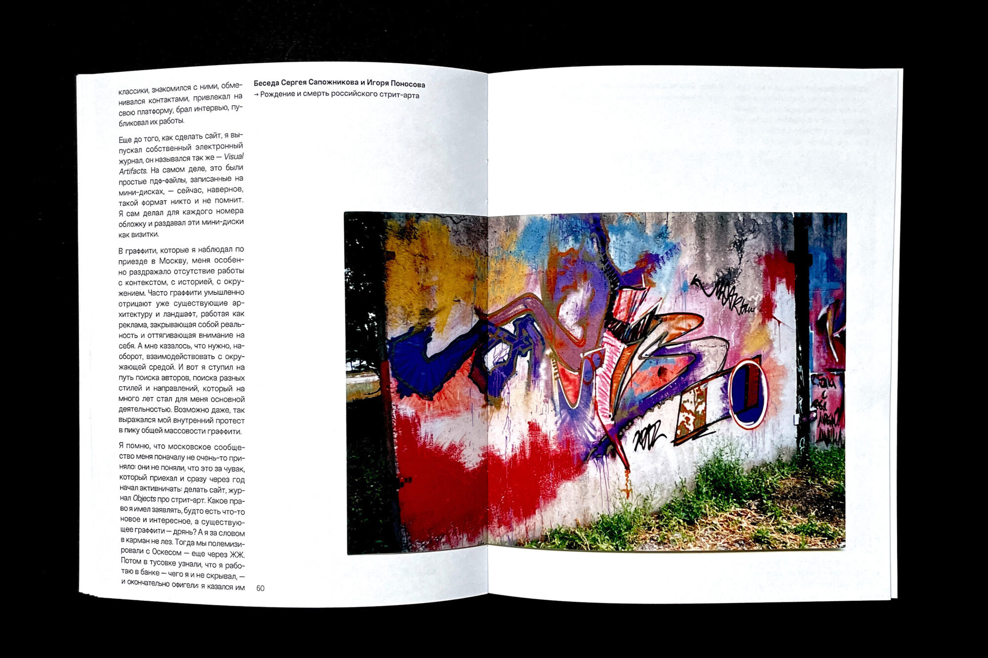 The book presents the early graffiti works of Sergey Sapozhnikov and his experiments from the early 2000s, which the artist created under the pseudonyms Sap and Metro, and later without any signature at all (|||¦||||). The core of the book is a conversation between Sergey and Igor Ponosov, who met through their shared interest in experimental street art.